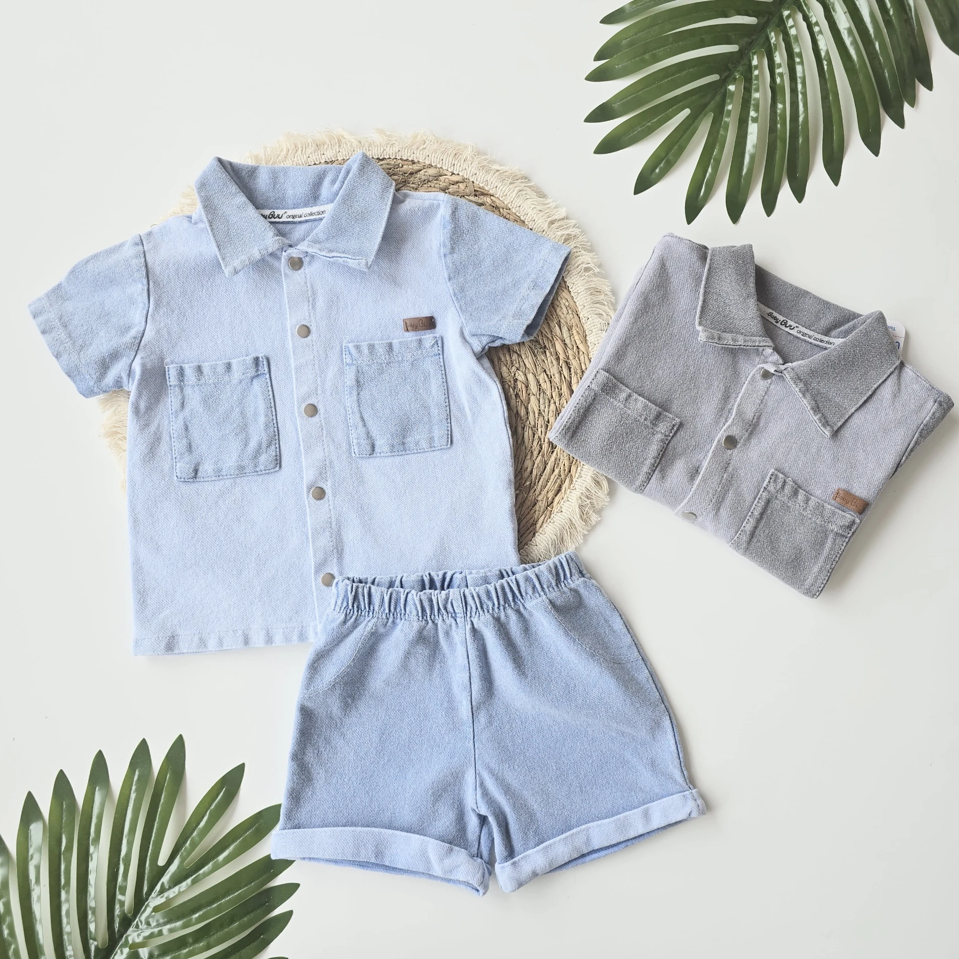 Bebek Takım Gömlek Cep Detaylı Şortlu Kot Görünümlü 6-24 Ay